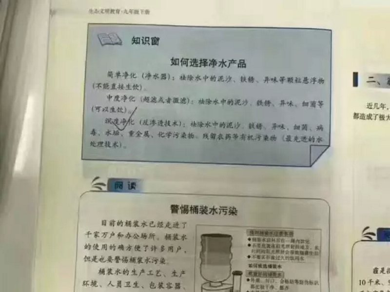 值得慶幸的是,現在國家相關部門已經對我們的“喝”有了足夠的重視。比如,教育部增加人們對潔凈水源的認知。目前只要你翻開學生的課本,就能看到凈水、普水的相關知識了,學習健康的飲水習慣也必須從娃娃抓起。