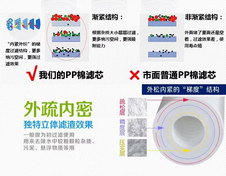 一般你收到濾芯,首先就捏下,看其硬度,一般越重的PP棉硬度越高,捏起來軟趴趴的PP棉就是很輕,就沒有那種捏起來比較硬的好。因為在同樣的水質情況下,越軟的PP棉用的時間越短,更換周期越短。