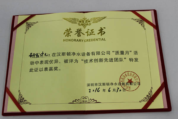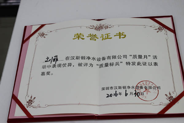 在本次“質量月”活動中,漢斯頓研發部團隊脫穎而出,其申請并通過的多項專利,如使用新型專利證書等,為公司凈水器技術突破做出了巨大的貢獻,獲得了公司頒發的技術創新獎榮譽證書,并獲得了2000元獎金。此外,質量部和生產部的員工表現也十分出色,“質量月”期間,他們以專業的態度和專注的質量檢查精神,認真而且細致地檢查好每一款產品,每一個生產環節,最終,10名表現突出的員工被授予“質量月”標兵獎,每人獲得200元獎勵。